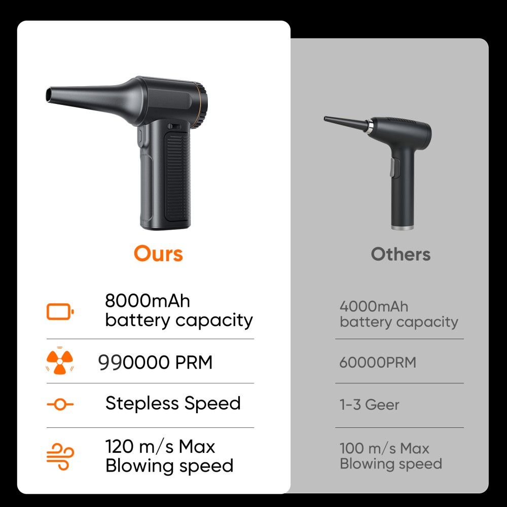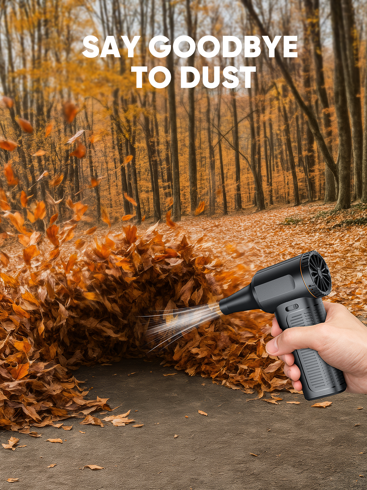 7.【Cordless Mini Air Blower】Compact and lightweight, this cordless handheld fan is designed for portability. It's a versatile tool suitable for tight spaces, including blowing away carbon residue, industrial dust, soot, cleaning keyboards, cars, motorcycles, consoles, crevices, foot mats, and even picnic garbage.